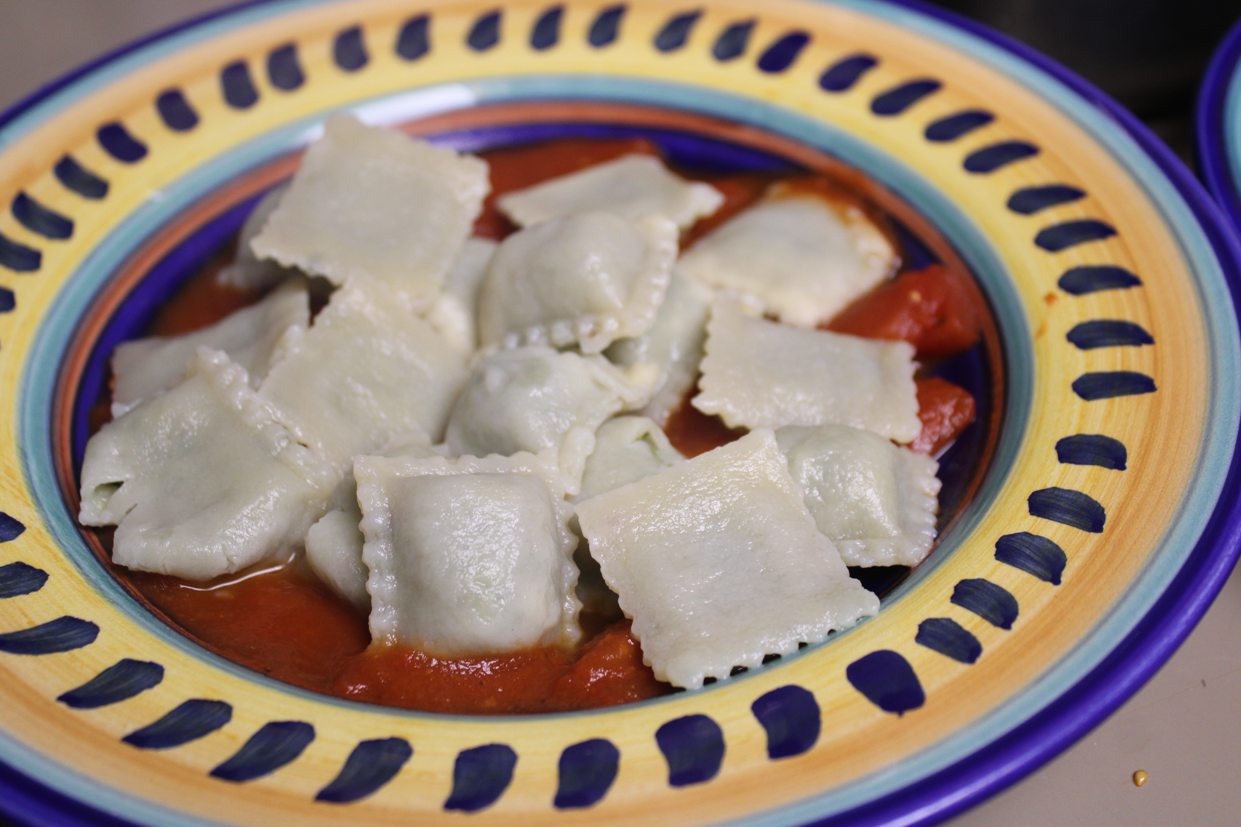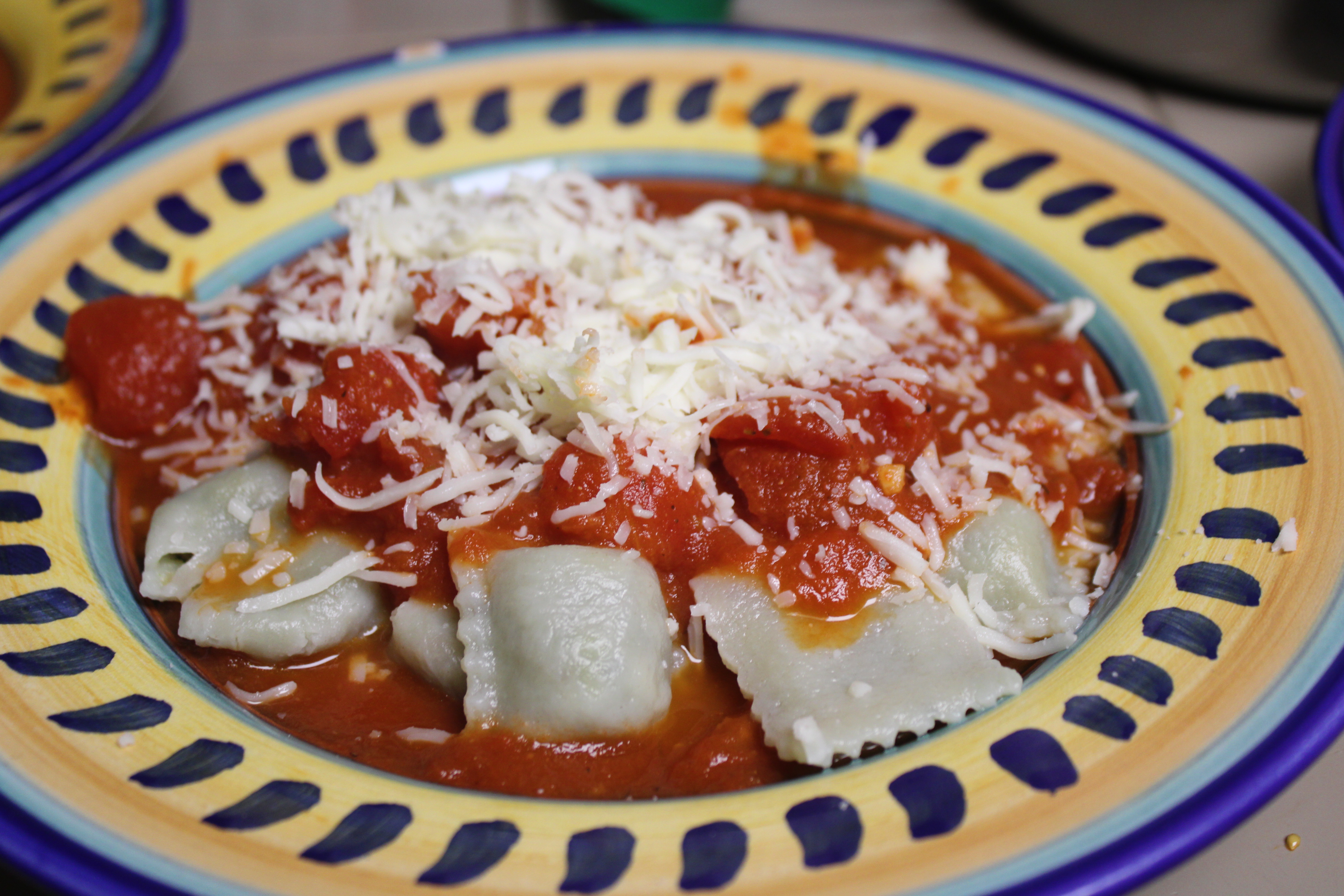 Ladle sauce in the center of a serving plate or individual bowls. Place Ravioli over sauce, top with more sauce. Garnish with Italian cheese, if desired, and serve.