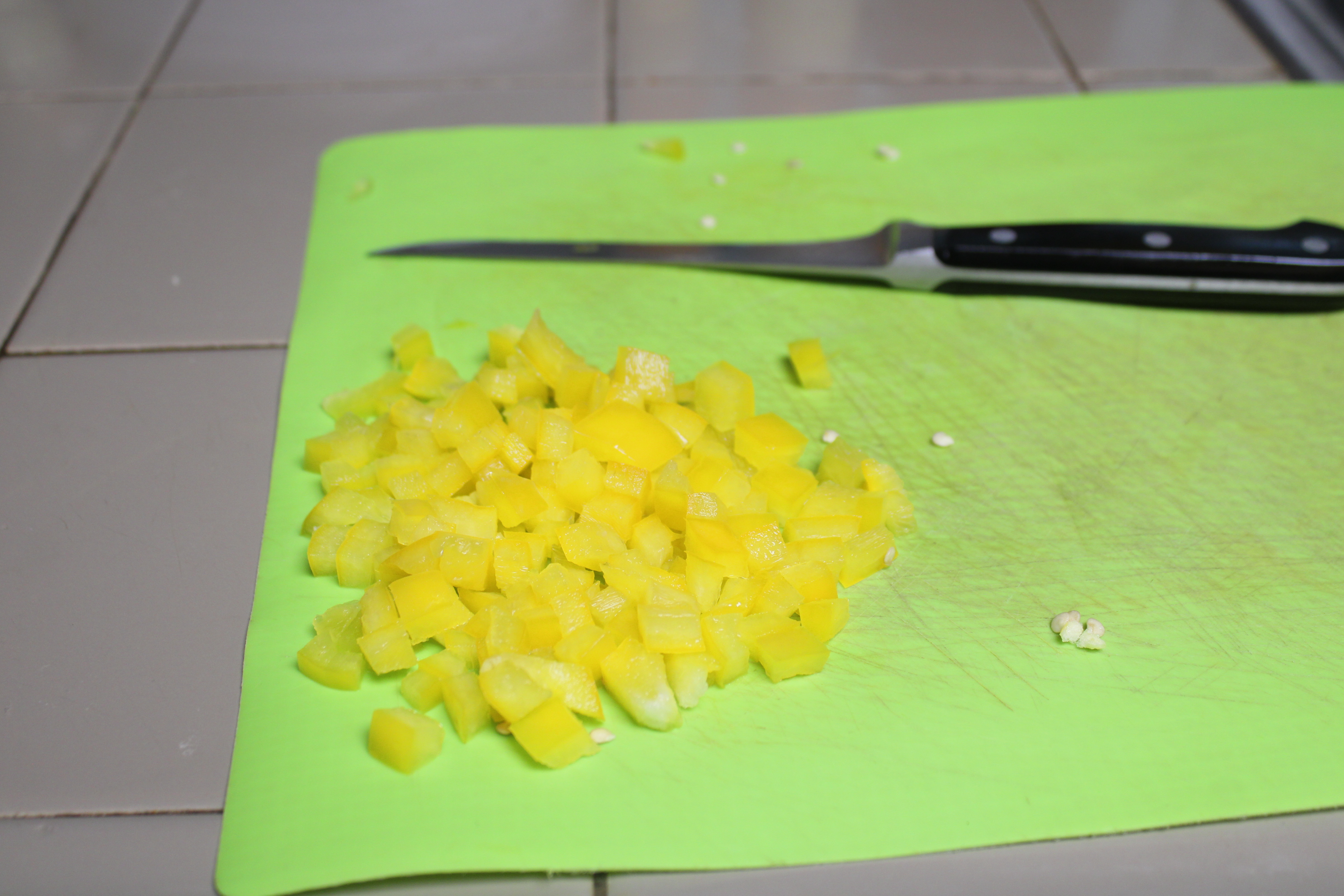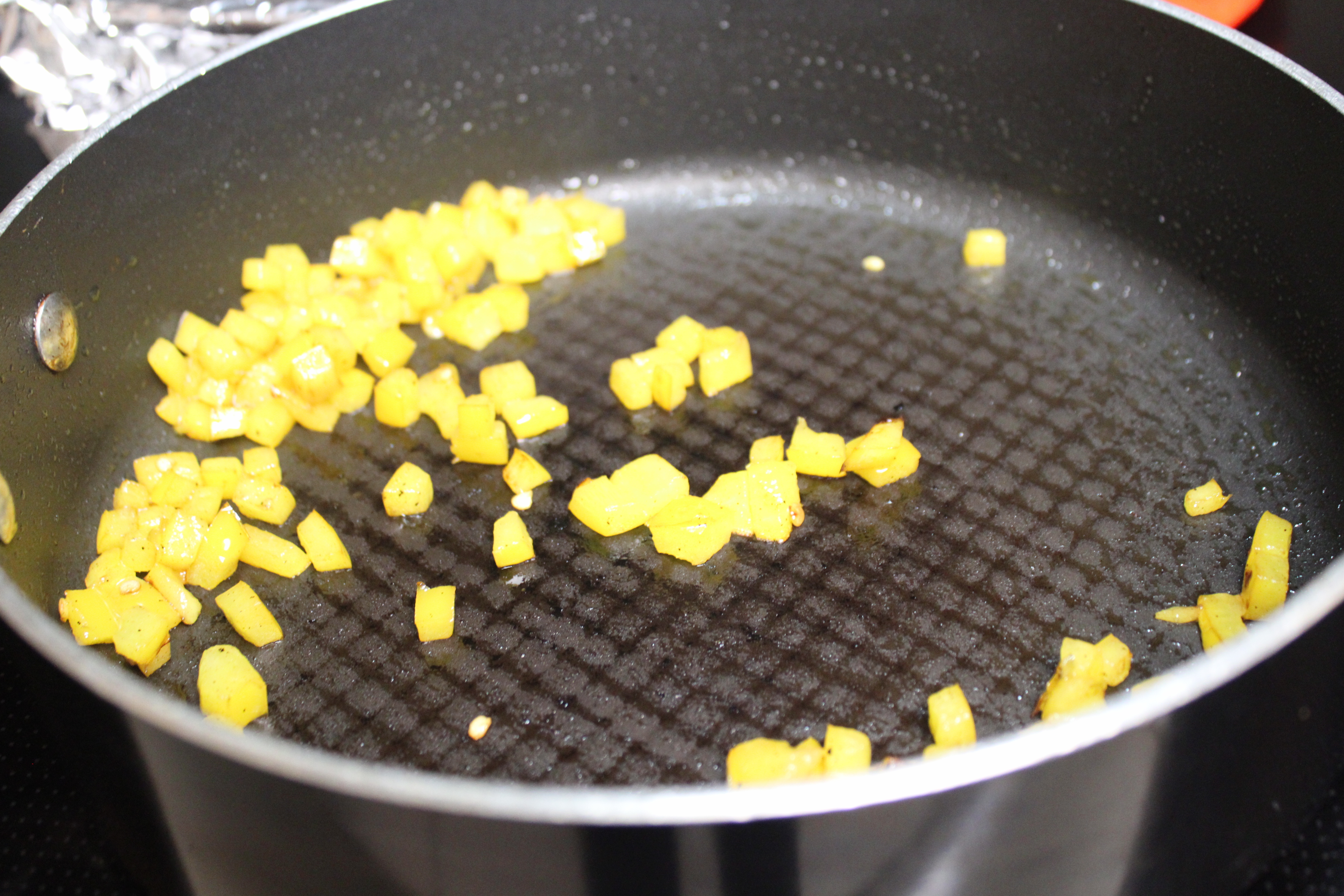 Stem bell pepper, remove seeds and dice. Place peppers in a skillet with just a splash of oil, sauté until tender. Set aside.