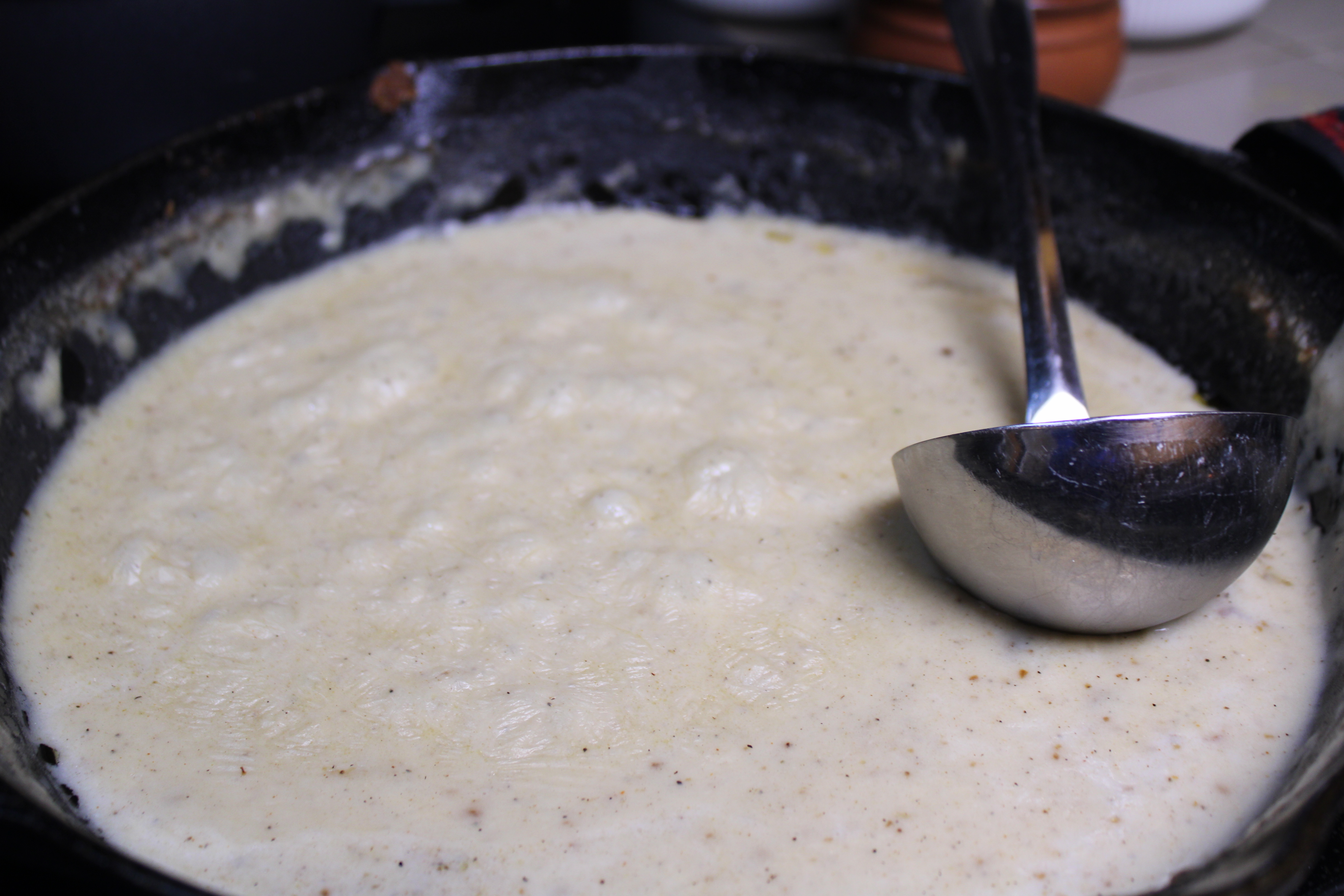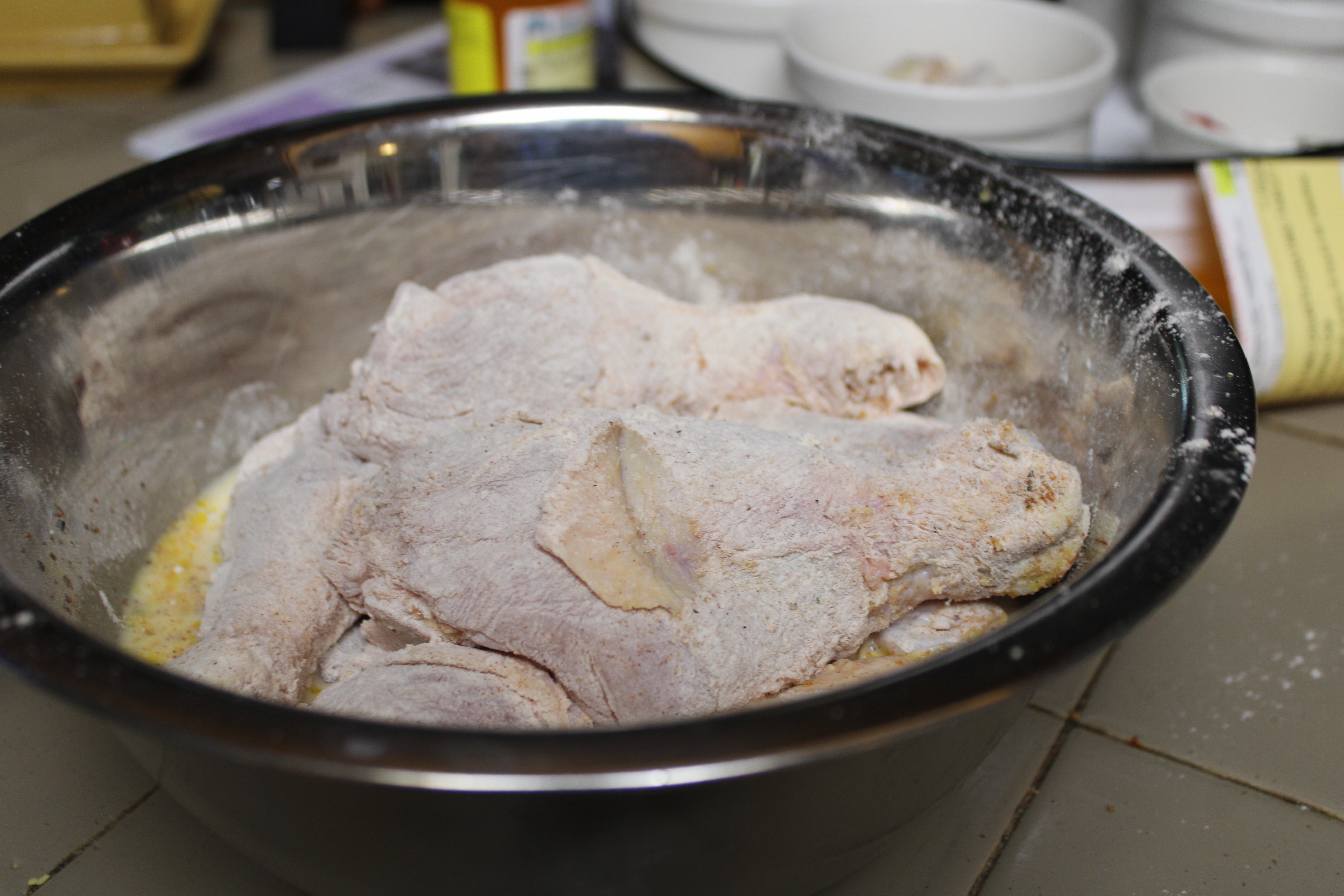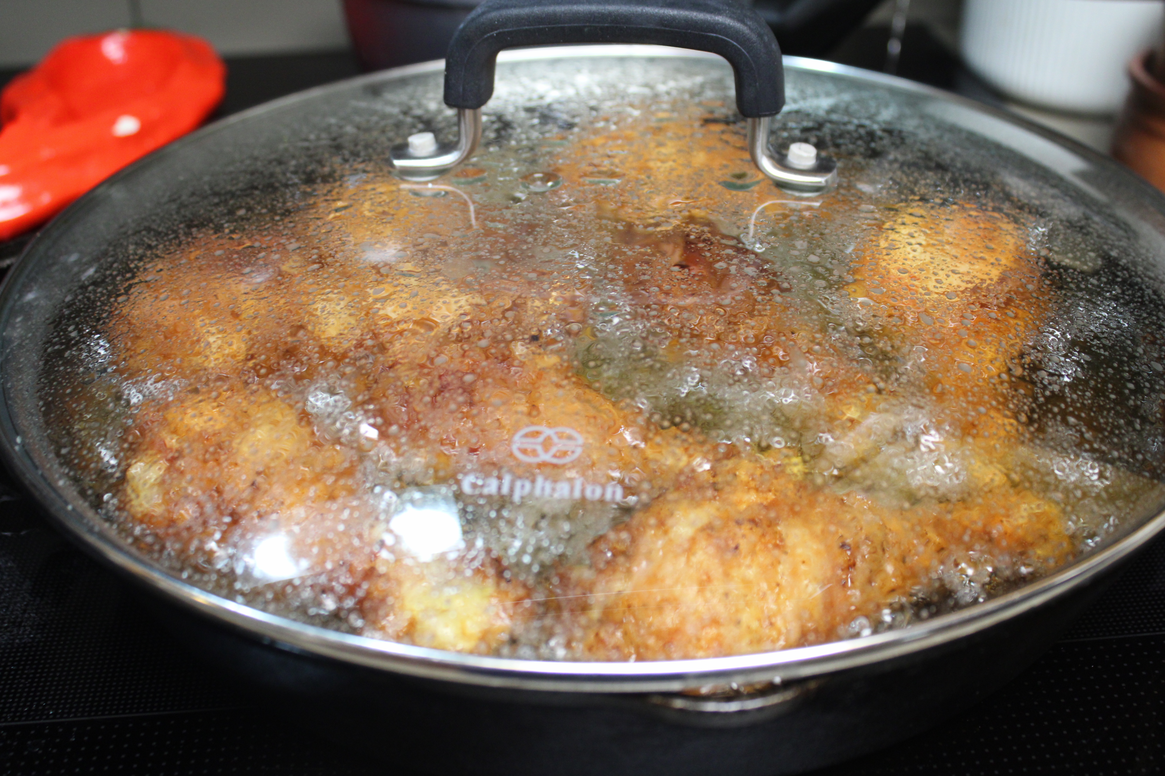 While the chicken is slowly frying, heat oven to 300 degrees and place a serving platter in the oven to warm.