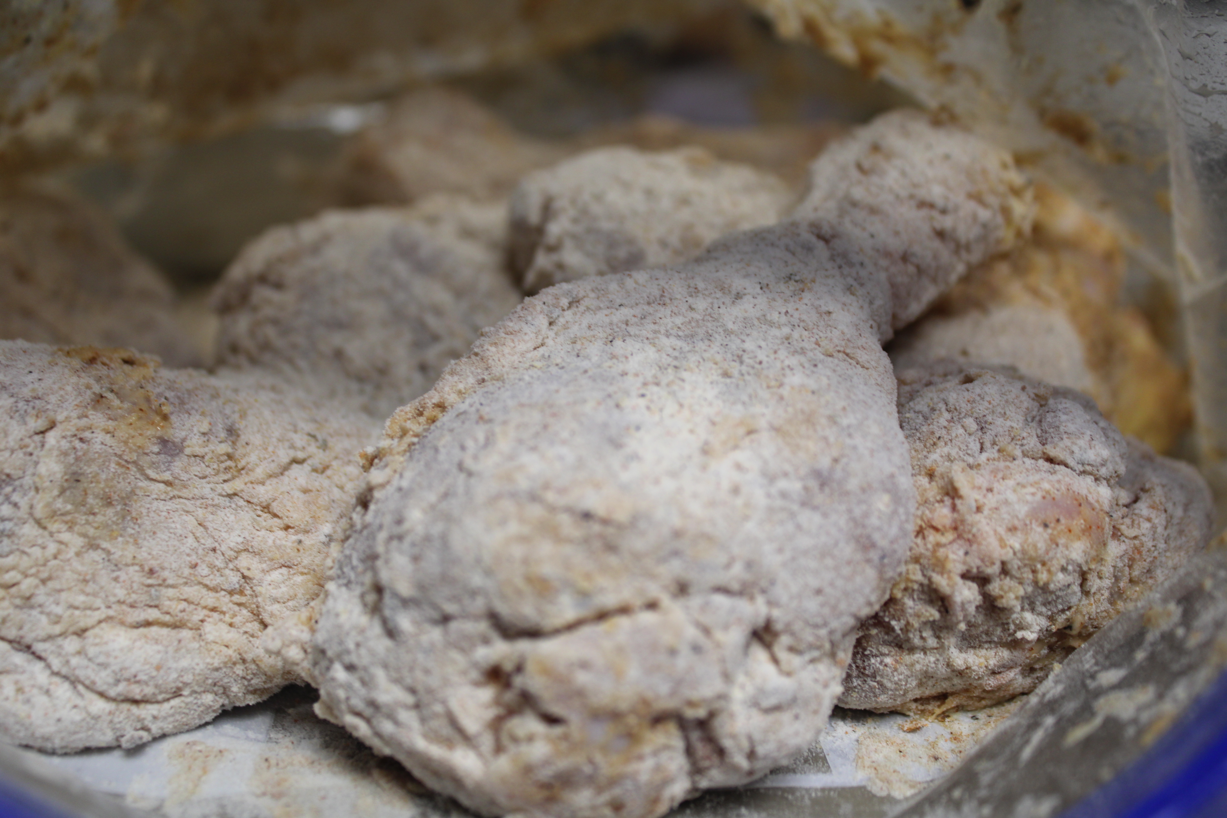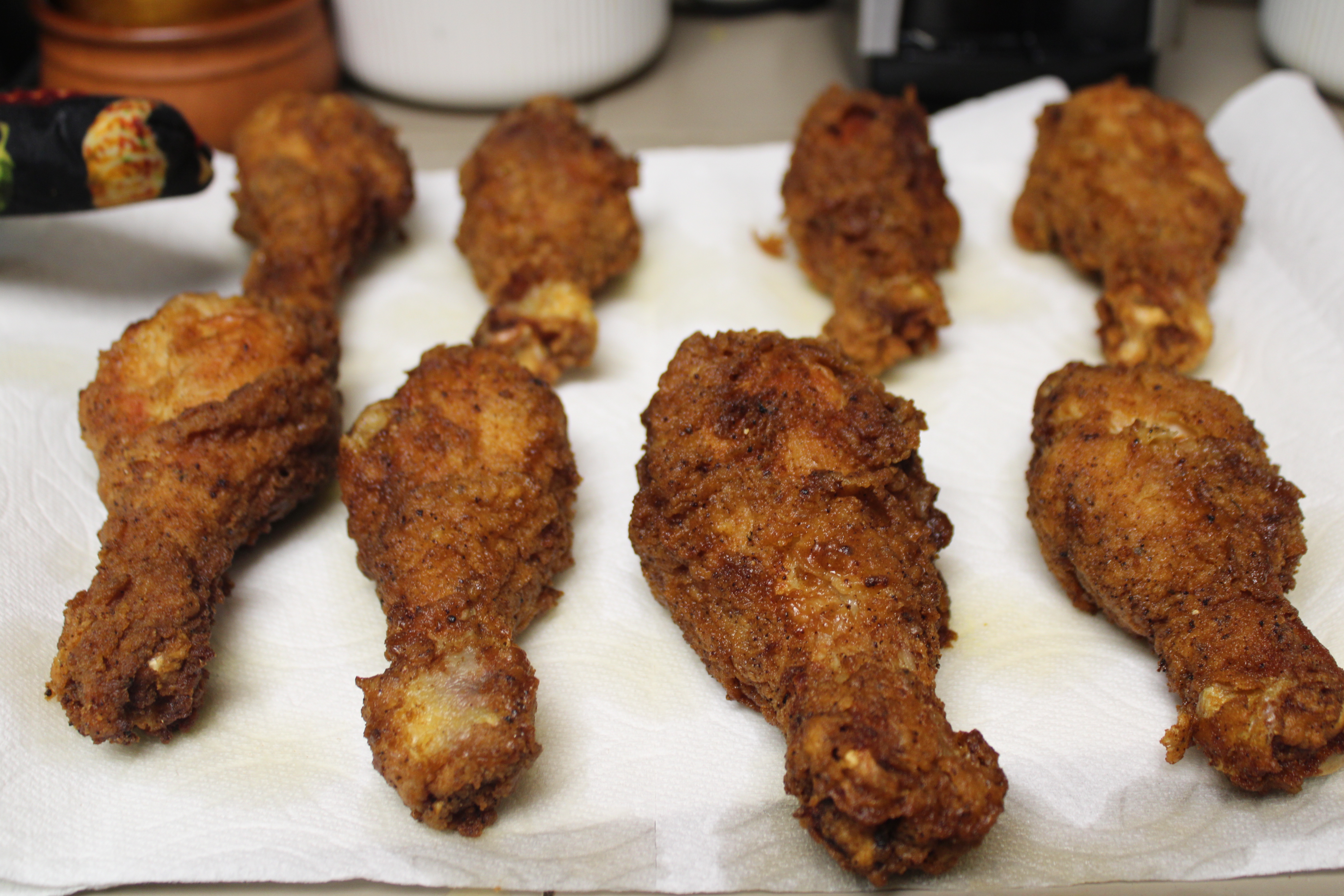 In a large skillet, heat oil to 365 degrees. Place coated chicken in the hot oil, and brown on all sides. Reduce heat to medium-low, cover and continue cooking chicken until tender, about 30 minutes, turning as needed for even cooking. Remove chicken from skillet, and drain on paper towels.