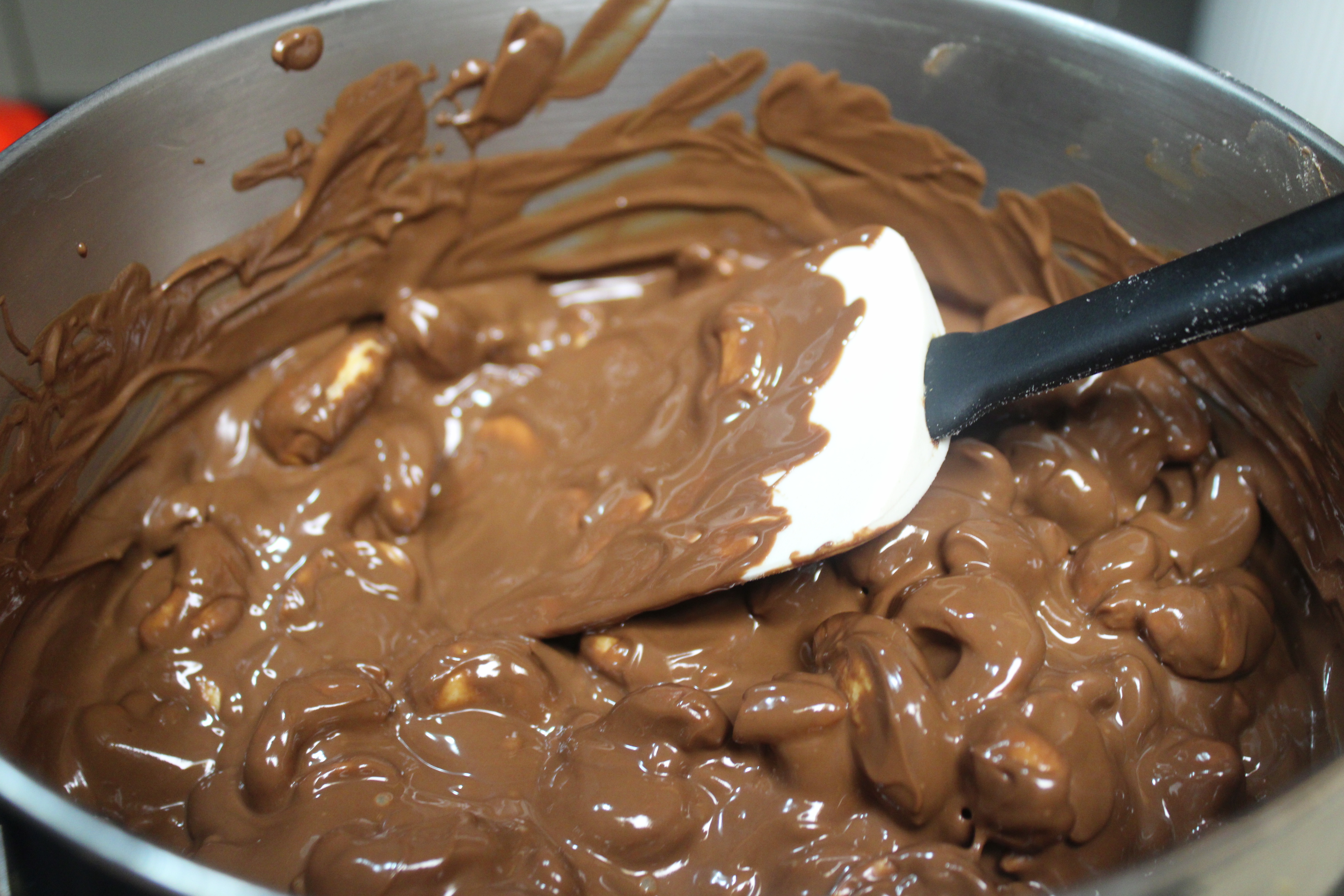 Add cashews, a handful at a time, stirring constantly to coat. Chop dark chocolate into smaller pieces. Add broken bits of Hershey’s Chocolate into the pot. Stir to melt dark chocolate into the cashew clusters.