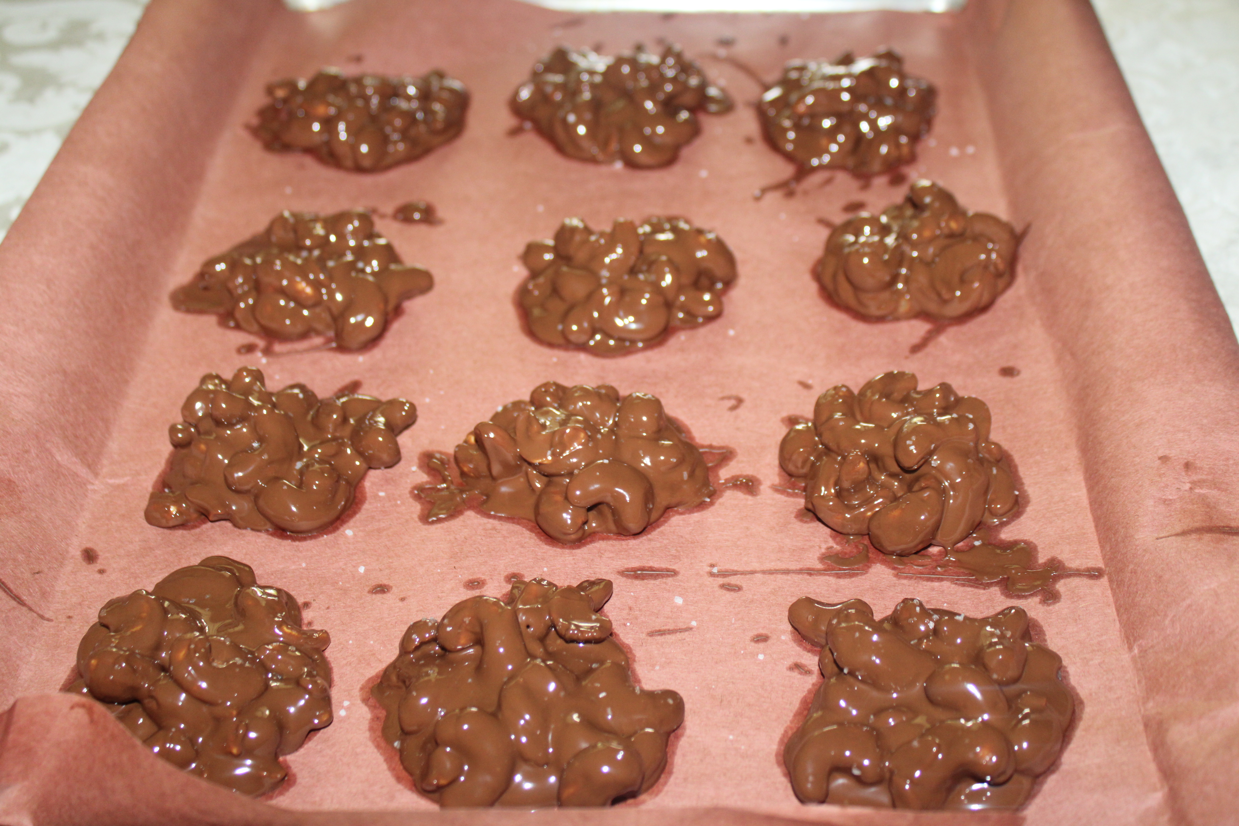 Use a place spoon to spoon onto waxed paper. Sprinkle with a pinch of salt while the chocolate is still warm. Let cool. Store in an air-tight container to enjoy as you please.