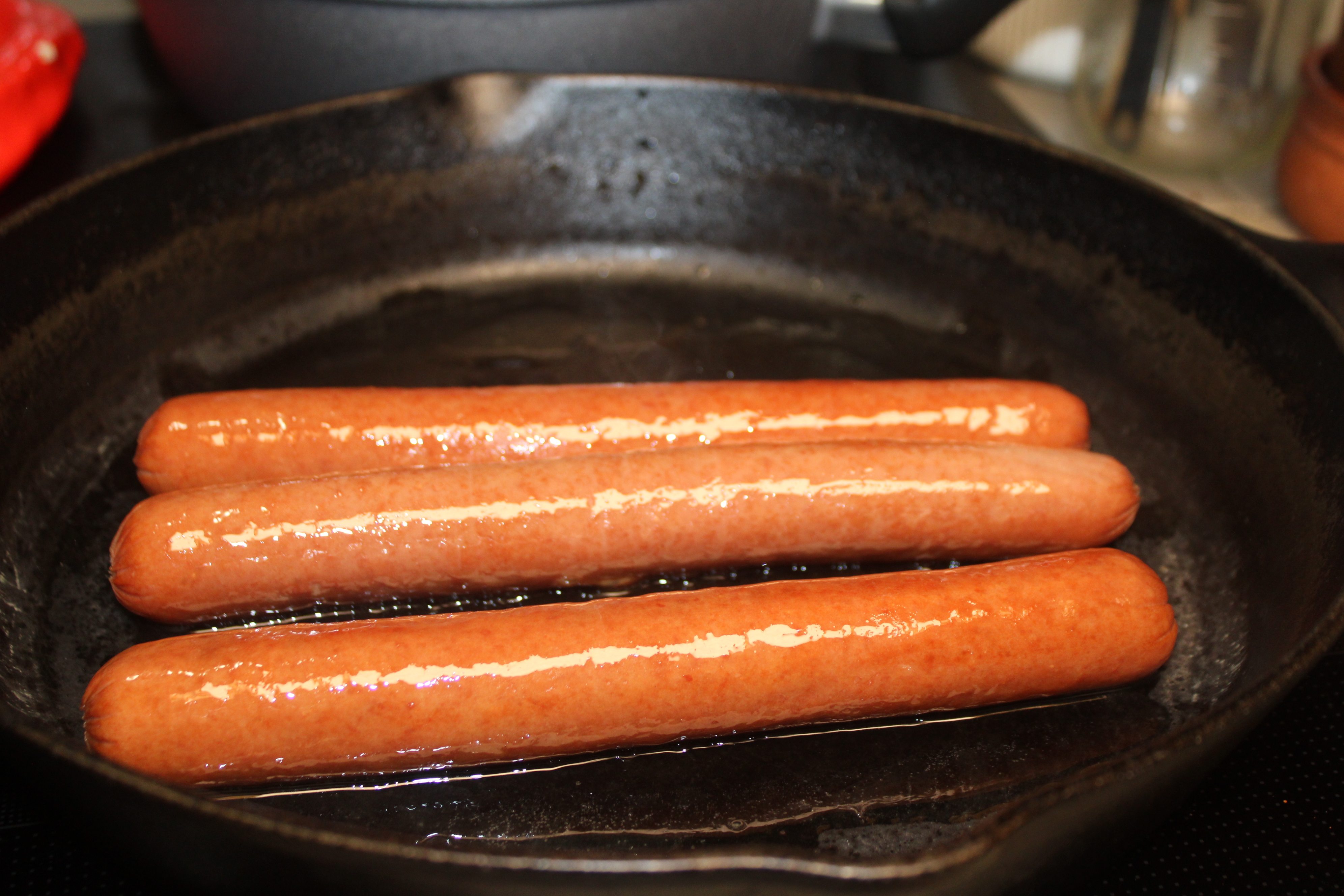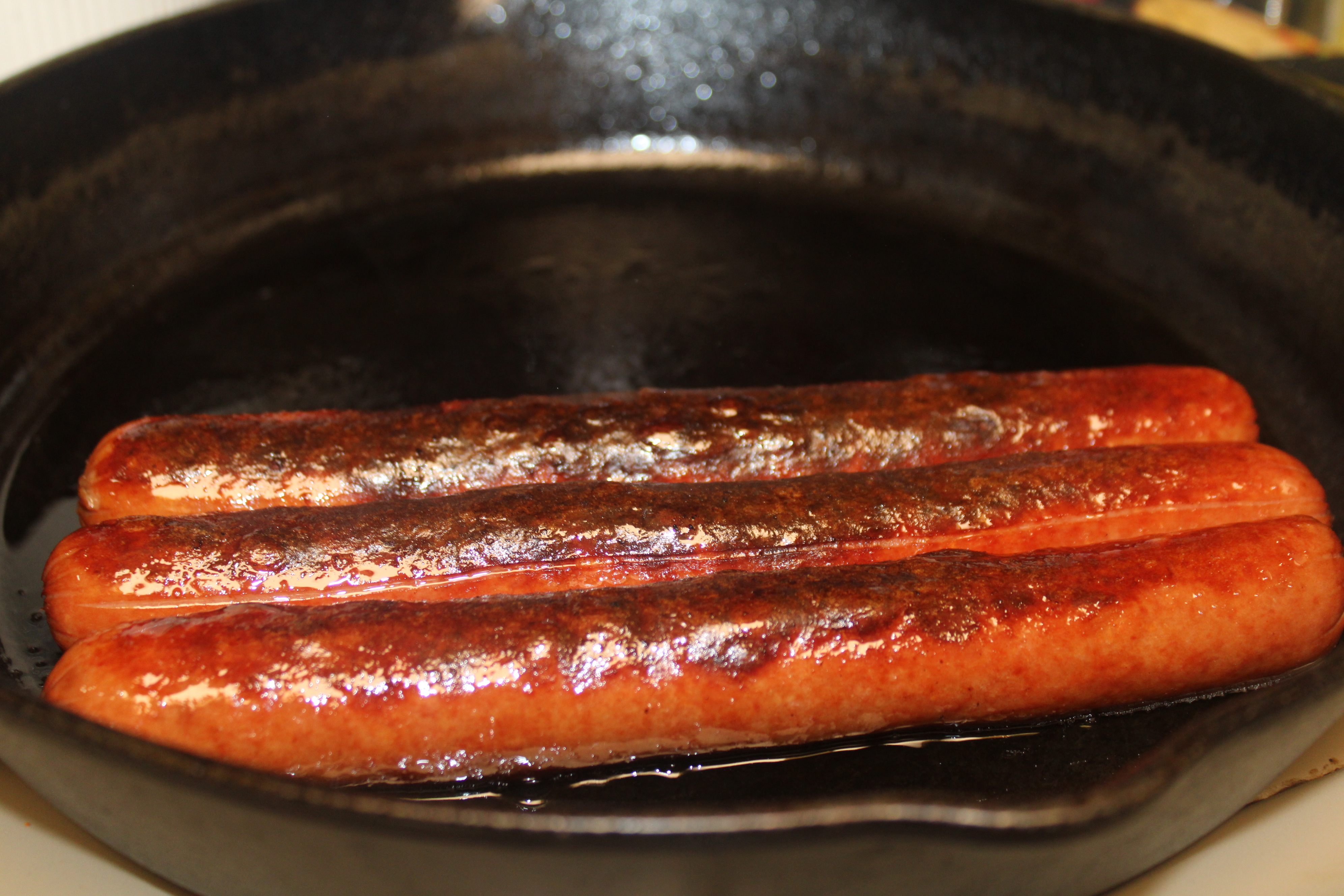 Heat cast iron skillet to medium-high. Add enough water to the skillet to cover dogs about half-way. Place dogs in the skillet, let cook until plump, turning as needed for even cooking. Add more water to keep dogs “steaming”.